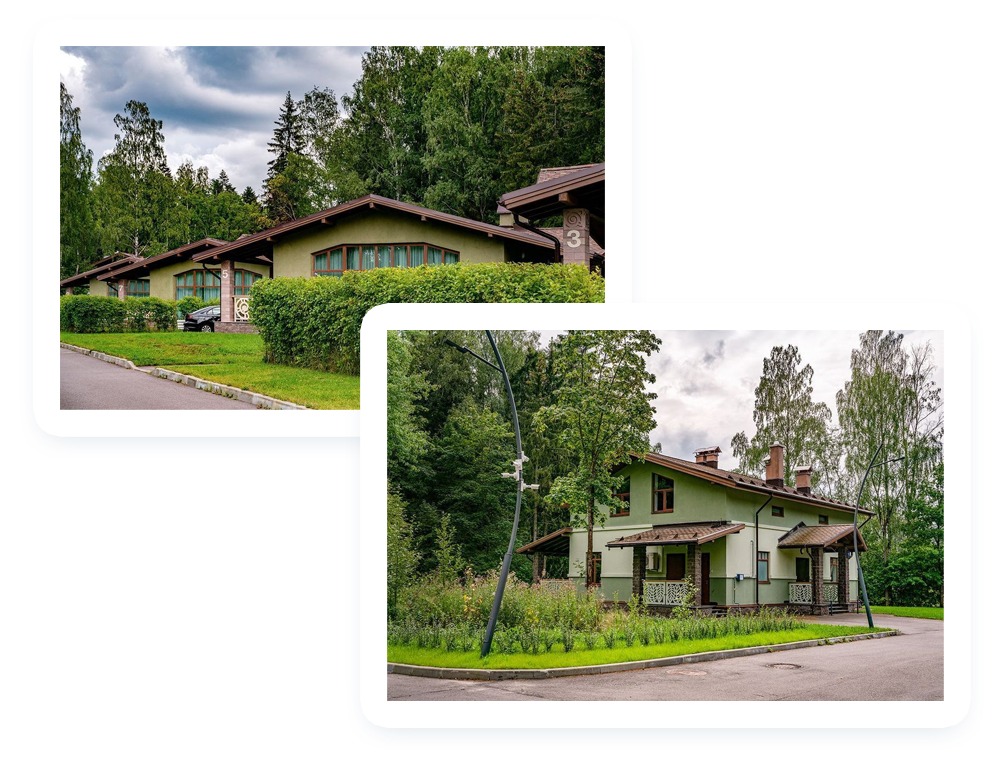 В каждом коттедже своя сауна, патио для барбекю. В комнате могут быть размещены семейные пары.